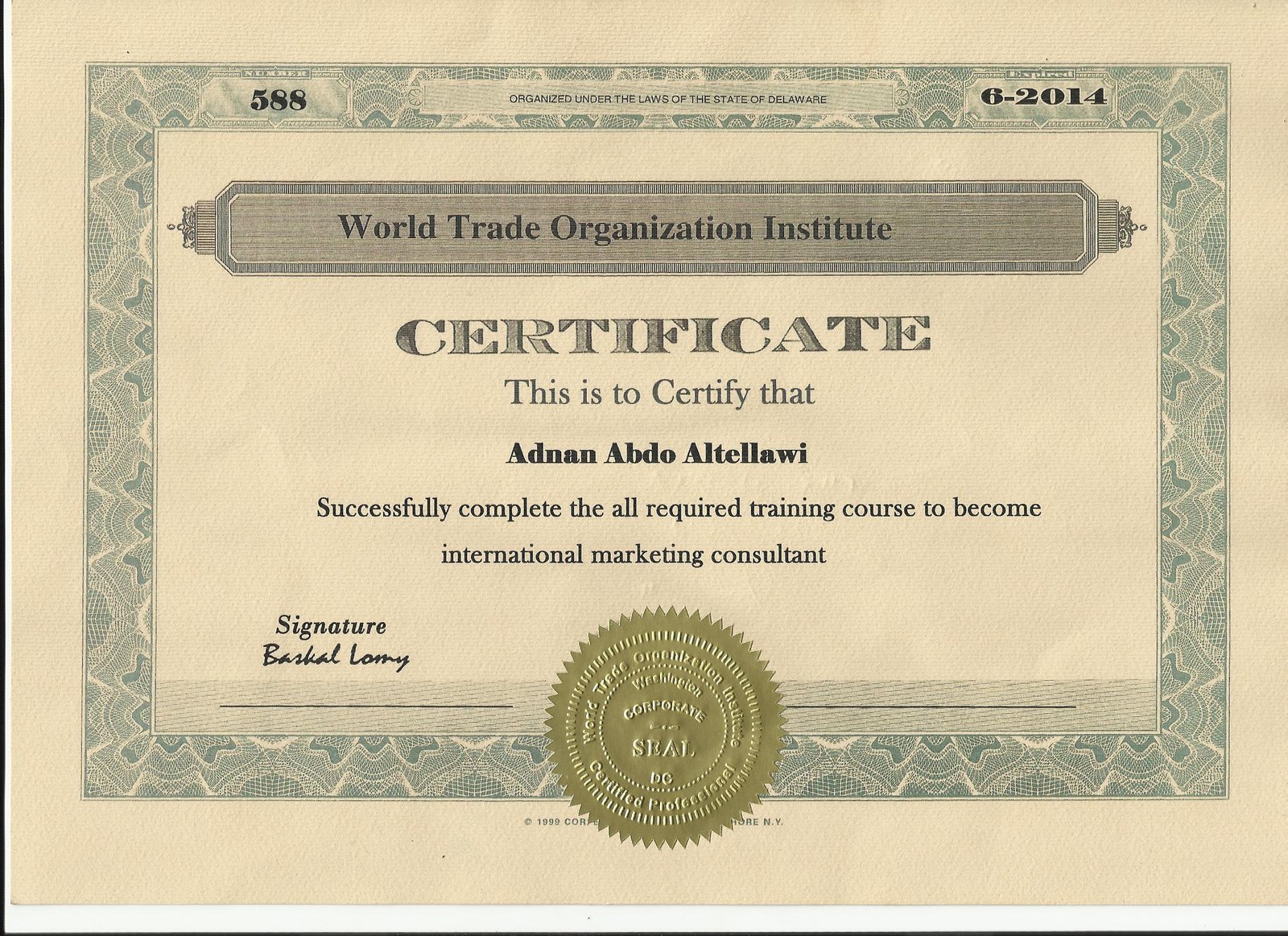 - يقدم معهد منظمة التجارة العالمية الان خدمة التصديق والتوثيق في عدد من الجهات :1- الشهادة معتمدة من معهد منظمة التجارة العالمية من واشنطن 2- توثيق الخارجية الأمريكية. 3- إعتماد أتحاد المصدرين والمستوردين العرب 4- إعتماد الوحدة الاقتصادية بجامعة الدول العربية. 5- توثيق من أي سفارة في العالم . |